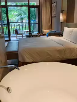 We checked in to a king room that was spacious, clean, and comfortable, complete with a viewing terrace and large bathtub. The bedding and the view outside the window are picture-perfect. The hotel also offers family rooms full of childish fun, but they were fully booked this time. Next time we'll have to stay in a family room.