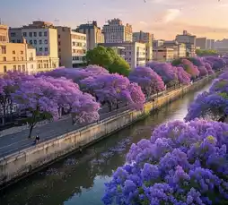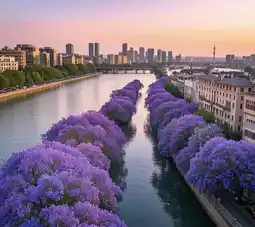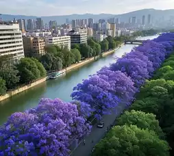 Panlong River: Ancient jacaranda trees planted during the 1999 World Expo reflect on the river surface. Take a boat ride on Panlong River (from Taoyuan Dock to Nantai Bridge) to experience "flower reflections flowing with the waves, like traveling through a painting."