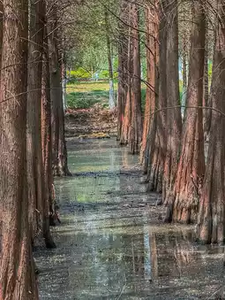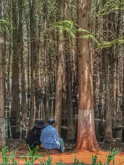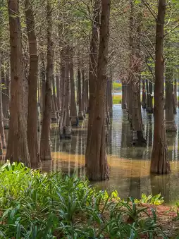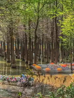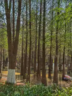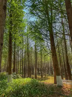 The wetland is rich with seasonal colors during spring — water plants begin to bloom, and tall metasequoia (dawn redwood) trees reflect on the calm water like a living mirror. Wooden boardwalks wind through reed beds and along shallow ponds, making it easy to explore without disturbing the habitat.
