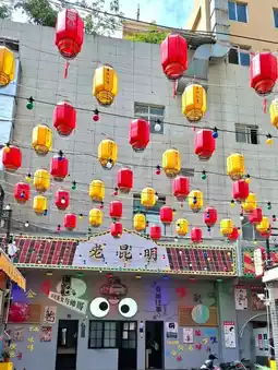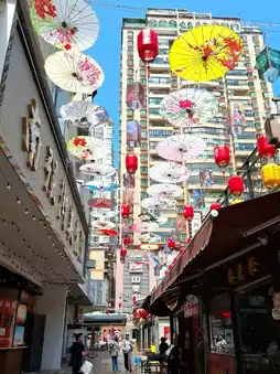 Hanging lanterns and decorative umbrellas along the pedestrian alleys near Nanqiang Street.