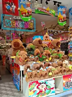 The storefront display is vibrant and colourful, with a variety of plush soft toys, particularly capybara, the brown bear-like characters creating a playful, whimsical, and welcoming atmosphere that likely appeals to both children and collectors of cute merchandise.