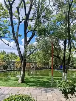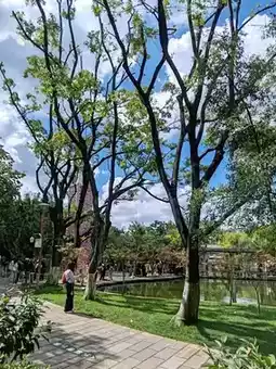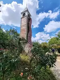 Enter through the East Gate of Green Lake Park and follow the main path. You’ll pass by the serene Bamboo Island. Continue through the bamboo groves, and soon you’ll reach the famous Jiulong Pool (Nine Dragon Pool). Just look up, and you’ll spot the clock tower wrapped in the rose waterfall, standing quietly by the water as if waiting for every visitor.
