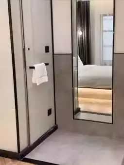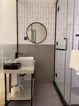 The black-and-white tiles in the bathroom collide with the round mirror to create a crisp feel, while the metal showerhead and bath amenities in the shower enhance the ritual of a “refined bath”; even the mirrored design in the corner quietly extends the visual depth of the space.