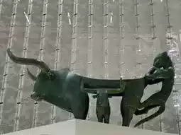 Another example, the "six men binding cattle bronze buckle ornament" depicts the fierce struggle of bullfighting.