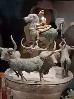 The shell container is a unique bronze artifact of the Dian Kingdom, decorated mainly with cattle, reflecting the Dian people's yearning for a better life. The shell container, a unique bronze vessel of the Dian Kingdom, is similar to a modern "piggy bank." The sea shells stored inside, as exotic treasures, once served as currency for the Dian Kingdom under specific historical contexts. The cattle image evolved from a practical lid knob to decorative art pieces, increasing in number and combining with bronze drums to form a unique artistic style. Notably, the decorative images on the shell containers are mainly cattle, and their evolution is quite ingenious. The original standing cattle may have served only as a practical "lid knob," but over time, it gradually evolved into pure decorative art.