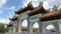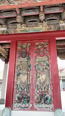 Fujian-Taiwan Heritage: Featuring red walls with swallowtail ridges, golden glazed tiles, gilded door ornaments, and Koji pottery decorations, it almost perfectly replicates the Lukang Longshan Temple.