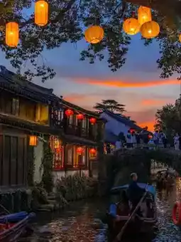As night falls in Zhouzhuang, the sunset paints the sky with fiery colors, turning the old bridges and canals golden. Lanterns light up along narrow lanes and over calm waters, creating shimmering reflections that seem to dance. The air grows quiet, and the town feels like a living painting—ancient, peaceful, and full of stories whispered by the water. It’s a perfect glimpse of the poetic Jiangnan people dream about.