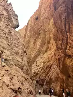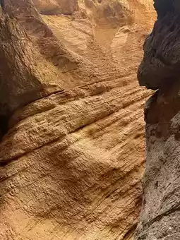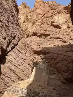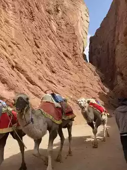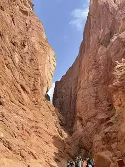 In the early morning, sunlight slants through the canyon's mouth, illuminating the red rocks like a blazing flame. The cracks between the canyon walls are so narrow that only one person can pass through. Looking up, one can see the sky sliced into a thin line. The sense of oppression and awe instantly calms one, as if transported to an ancient time.
