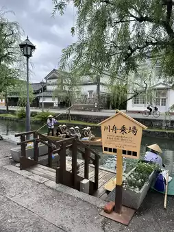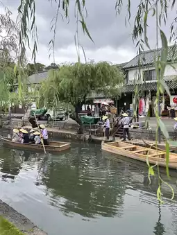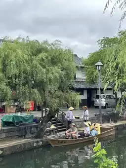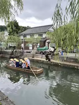 The boatman, holding a bamboo pole, introduced the beautiful history and culture of Kurashiki. He was wearing a bamboo hat. The willow trees by the river were drooping, and the white walls of the Western-style buildings and the boatman's blue denim clothes were reflected, which was very interesting.