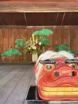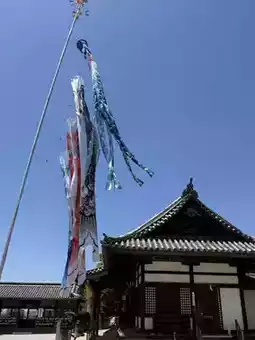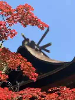 Interestingly, this spring has been unusually cold and warm, and despite it being early May, the maple leaves in front of the shrine are vividly red. This creates a unique scene combining autumn maple leaves, Children's Day carp streamers, and wisteria flowers—a condensed view of four seasons in one.