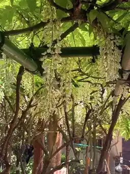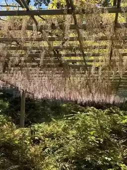During the wisteria season, I revisited Achi Shrine to see the famous Achi Great Wisteria. This wisteria, of the 'Akebono' variety, is estimated to be at least 300 years old, with some speculating it could be as old as 500 years. Located behind the shrine, its branches stretch over 20 meters, and its flowers cascade down from the trellis, swaying gently in the wind. The wisteria had once withered and dried up, but thanks to the shrine's efforts in hiring tree doctors, it was revived and flourished again. Nearby, a white wisteria planted later is also in full bloom.
