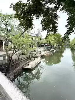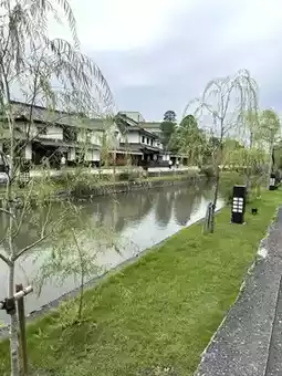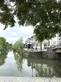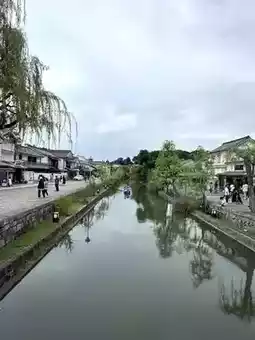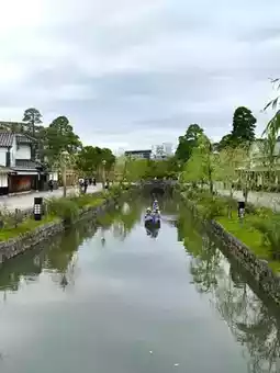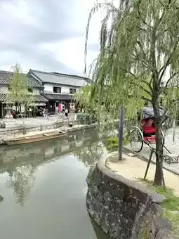 The Kurashiki River is lined with cafes and other shops renovated from traditional townhouses, rickshaws, and riverboats.
