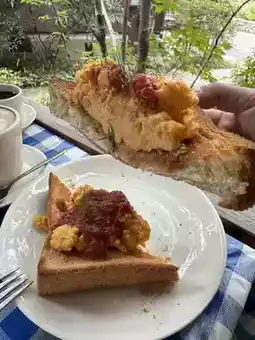 The omelette toast is a fluffy omelette topped with tomato sauce, making it delicious. It was delicious! 🍅