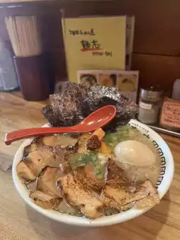 - They use homemade noodles from Fukuoka Prefecture, "ラーMai", and serve with a rich broth made from 100% tonkotsu, which is rich but not too greasy.