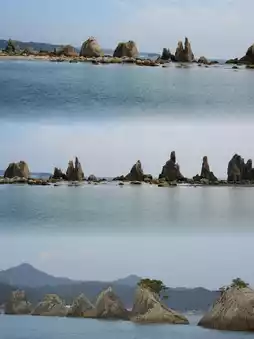 🪧 Hashigui-iwa Rocks: Facing Oshima Island from Kushimoto, over 40 large and small rock pillars line up in the sea, stretching for about 850 meters. They are named Hashigui-iwa, meaning "bridge pier rocks," because their regular arrangement resembles bridge piers. Located within the Yoshino-Kumano National Park, they are designated as a national scenic spot and natural monument.