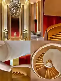 The hotel lobby features a pure white spiral staircase standing serenely in the minimalist hall. The 13-meter-high spiral staircase winds upward to an aerial corridor, as if defying gravity and flying into the sky.