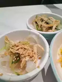 There are fried chicken skin, chicken slices, chicken jerky and chicken pieces, and a vegetable platter. The fried chicken skin is still very crispy after soaking the soup. The chicken slices and chicken pieces are tender, and the chicken jerky tastes sweet.