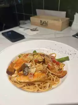 His pasta used tomato sauce plus toasted tender chicken breast, and some mushrooms and asparagus, sour and sweet and appetizing. And the after-meal dessert heart tart eat very melty, chocolate flavor is strong enough. It's great with ice cream and ice and fire. Finally, I drank a cup of sweet mango shake to relieve my hunger. I was very satisfied and full 👍🏻 The restaurant served with a salad that was sweet and sour and delicious🤤