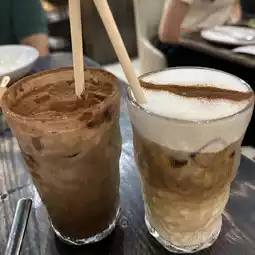 Very bouncy noodles, can eat crab meat and mint 😬 plus a very creamy and rich sauce, salty and fragrant, the taste is very rich 🤗 Hot cream soup taste smooth, good to drink 😍 Chocolate coffee, coffee taste very rich, sweet and smooth!