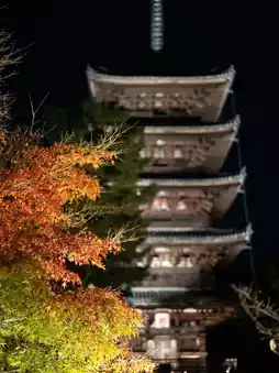 The historic five-story pagoda and Omuro Palace are illuminated in soft light, and the red and orange autumn leaves stand out against the night sky, creating a breathtaking beauty🍂. The illuminated autumn leaves reflected in the garden create a spectacular mirror-like scene on the surface of the water, and you can't help but stare at them💡.