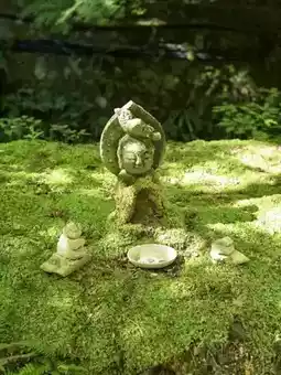 Hidden among the moss carpet are small Jizo statues, posing with their cheeks resting on their hands, sitting in meditation, or daydreaming... absolutely adorable! They blend seamlessly with the moss🌱 of the Yuseien Garden, like little spirits🧚 guarding the temple.