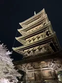 Toji Temple at night is not just for cherry blossom viewing, every corner of it exudes a mysterious charm. The tall figure of the Fuji Sakura, which is over 120 years old, is like an elegant old man, quietly guarding this land. When I stood next to it, feeling its grandeur and the weight of its history, I couldn't help but feel awe in my heart. The reflection of the five-story pagoda flickers on the lake, making me feel the passage of time and the interweaving of eternity. At this moment, the surrounding noise seems to be attracted by the tranquility. People around are immersed in this beautiful scenery and share this unforgettable experience with each other.