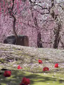 As you pass the plum grove of "Spring Mountain", there is a spot where you can enjoy the view of "weeping plums and fallen camellias" 🩷💚❤️