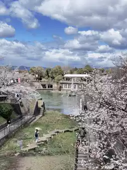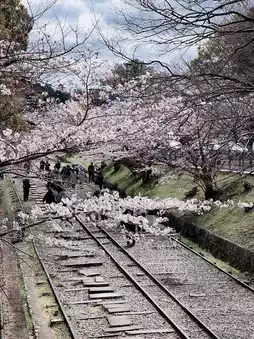 The cherry blossom trees lining Takase River create a magical world as their petals reflect on the water's surface, while at Keage Incline, cherry blossoms bloom gracefully over the unused railway tracks, gently embracing the passage of time.
