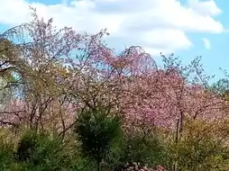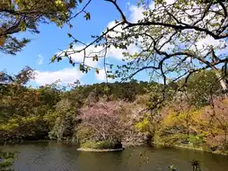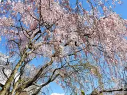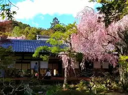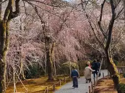 Ryoanji Temple has several great spots for cherry blossom viewing. First is the Kyoko Pond, where cherry trees are planted around the landscaped water garden, exuding a lively beauty. Following the path to the Hojo Garden, the weeping cherry tree at the entrance is the second photo spot. Lastly, within the Hojo Garden, the Zen-style rock garden features cherry blossoms hanging from the eaves, creating a serene and harmonious beauty.