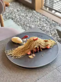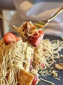 Crispy pie, sweet and sour mille-feuille of seasonal strawberries, and plenty of squeezed Mont Blanc cream!