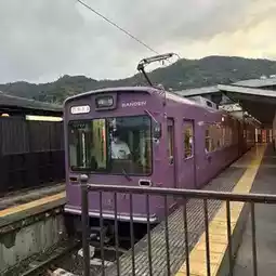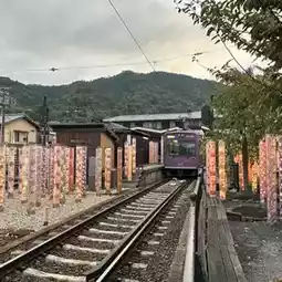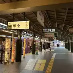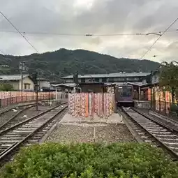 Arashiyama Station is the terminal of the Randen (Keifuku Electric Railway) Arashiyama Main Line and one of the primary ways to access the Arashiyama area. The Randen itself is a historic railway line, offering picturesque views along the way and nostalgic interiors in its carriages. Upon arriving at Arashiyama Station, visitors are greeted by the station's rustic and elegant architectural style, harmoniously blending with the surrounding natural scenery. The station's interior is adorned with traditional Japanese elements such as lanterns, wooden carvings, and bonsai, creating a cozy and inviting atmosphere.