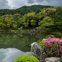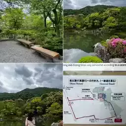 The garden is beautifully decorated. Every corner is beautiful. There are many trees. There are places to sit and relax. There is a pond with fish. It is also a famous place to see the changing leaves in Kyoto.