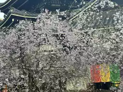 Within the temple grounds, the weeping cherry trees are in full bloom, creating a stunning sight. Next to the cherry trees stands a massive willow tree, with its vibrant green branches contrasting beautifully against the red blossoms. This willow tree, known as the "Enmusubi Rokkaku Willow," is one of the temple's highlights.