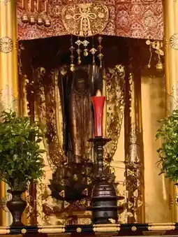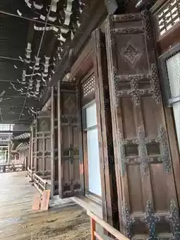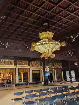 The highlight is the Goei-do Hall (rebuilt in 1636), which boasts 227 wooden pillars and is the world's largest wooden structure. A seated wooden statue of Shinran Shonin (Goshin-egi) is placed in the center of the inner sanctuary. The Amida-do Hall (rebuilt in 1760) boasts a majestic interior, richly decorated with gilded ornaments, a typical example of the Momoyama period's artistic style.