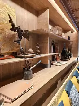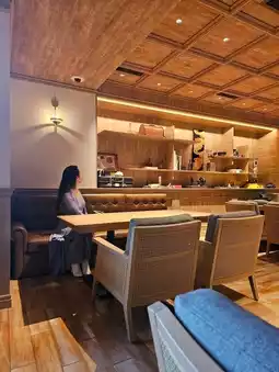 A photogenic social lounge with a bi-color design of wood and black. Free coffee (Kyoto's "Ogawa Coffee") is available in the morning, while the lounge operates as a café during the day and a bar at night.