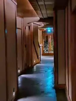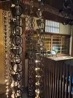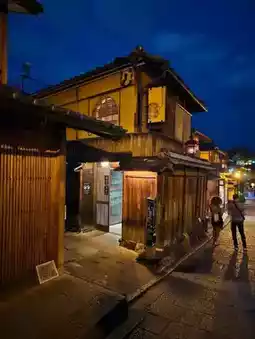 A Japanese-style exterior with a distinctive wooden townhouse and stone paving