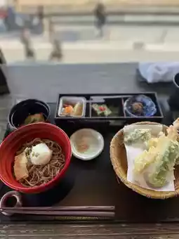 Arashiyama Yoshimura is one of the popular restaurants in Kyoto! The queue was pretty long and we waited for about an hour before we could get our seats. The wait was all worth it when we got a seat by the window. The scenery was so nice when we got to enjoy our soba while watching the river and passersby. We ordered Arashiayama set meals in both hot or cold soba and they came with assorted tempura.