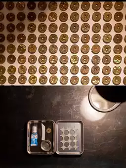 Concept: A golden wall of 5-yen coins. The 5-yen coin serves as a symbol of faith at shrines and temples. Ohira created a room in Kyoto, a city famous for its many shrines and temples, where the 5-yen coin and "fate" are connected. Ohira hopes to foster connections with past, present, and future guests and add to the hotel's history.