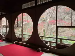 The temple's garden features a fish pond surrounded by various maple trees. Its unique indoor reflective low tables create stunning mirrored views of the autumn scenery.