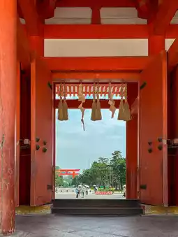 The vermilion-lacquered shrine building is said to recreate architectural techniques from the Heian period.