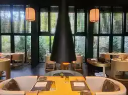 The outdoor garden with moss-covered tables was breathtaking. I was seated at a window-side table, offering a picturesque view of the garden.