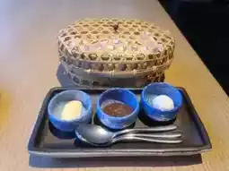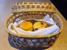The courses continued. Following the soup, panna cotta was served, offering a perfect balance of sweetness. Next came scones, presented in bamboo containers.