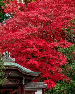 Vibrant red maple leaves adorn the entire temple, making it dreamlike and ethereal