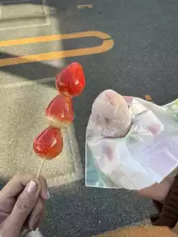 • The snacks around the shrine are also amazing, such as candied strawberries 🍓 and strawberry daifuku.