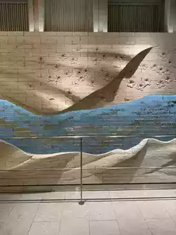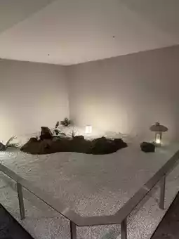 The spaciousness and waterfall (a small stream of water) create a relaxing space.