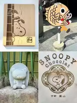 Start your stroll near Togetsukyo Bridge, where the gentle flow of the river and lush green mountains create a peaceful backdrop. Then, wander through the quaint streets dotted with bamboo fences and discover adorable landmarks — a stone Rilakkuma statue, a wood-carved Snoopy peeking from behind bamboo, and the elegant Snoopy Chocolat Arashiyama café and shop.