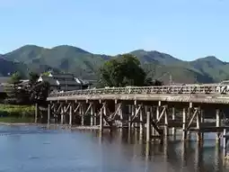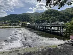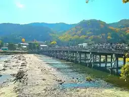 This bridge spans the Oi River (also known as the Hozu River) and offers a stunning backdrop of the Arashiyama mountains.