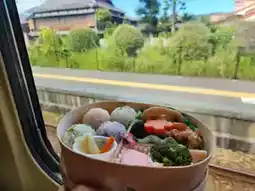 There are many facilities on the train and a variety of meals are provided to make the ride more enriching. I specially ordered the "Yufuin Wheeled Rice" for 1,000 yen (tax included). The portion was generous and the taste was quite delicious, which made me even happier when I enjoyed it in the car.