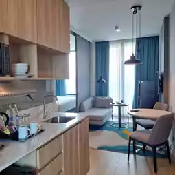 There are many types of rooms to choose from here ... This time we chose to stay in the One Bedroom Suite, which is the most popular room in this building ... The interior is clearly divided into areas for use: a bedroom, a living room, a small kitchen for heating food to eat, an iron, a hair dryer, and a washing machine.