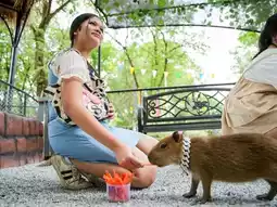 #PattayaTravel Today, we're taking you to Tigertopia, a tiger zoo in Sriracha, Pattaya. Our main goal is to play with two newborn capybara babies, all wearing adorable gold and silver necklaces. Min loves that it's a small zoo, not too big, perfect for a relaxing visit. There are tiger shows, crocodiles, and lions, photo opportunities, walking tours, feeding, and a variety of activities. There are also cute animals like goats, rabbits, and the capybara we just met.